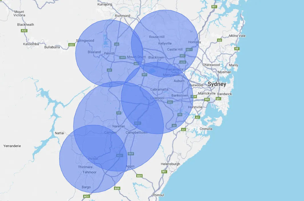 Penrith, Glenmore Park, Jordan Springs, Cranebrook, Emu Plains, St Marys, Blacktown, Mount Druitt, Seven Hills, Kellyville, Castle Hill, Rouse Hill, Parramatta, Merrylands, Liverpool, Casula, Prestons, Fairfield, Cabramatta, Wetherill Park, Campbelltown, Narellan, Camden, Ingleburn, Minto, Gregory Hills, Gledswood Hills, Picton, Tahmoor, Thirlmere, Bargo, The Oaks, Silverdale, Oakdale, Orangeville and more.